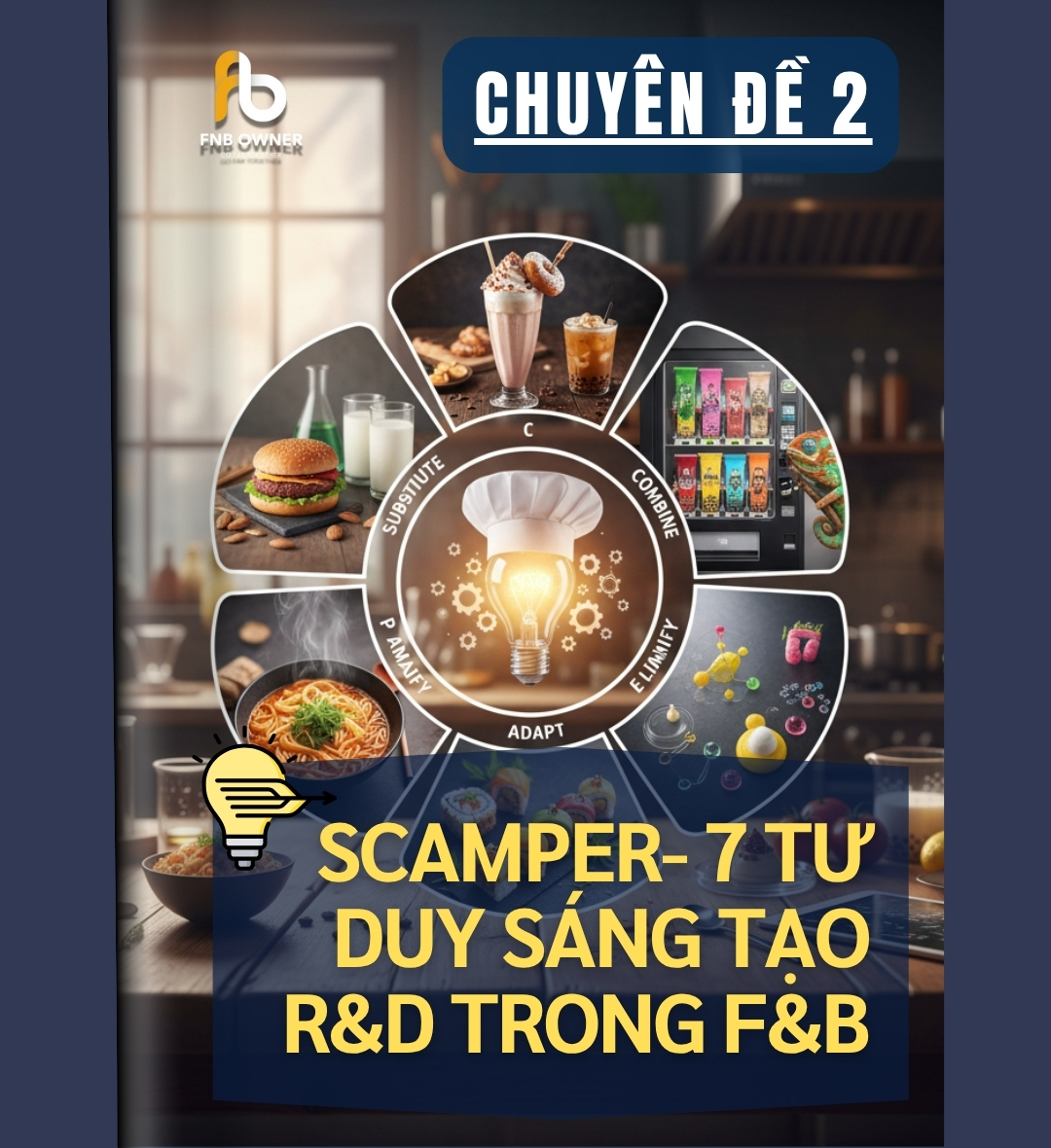 SCAMPER là công cụ tư duy sáng tạo, giúp cải tiến sản phẩm/dịch vụ qua 7 hướng: Thay thế, Kết hợp, Thích nghi, Sửa đổi, Tận dụng, Loại bỏ, Đảo ngược. Phương pháp này kích thích đặt câu hỏi, nhìn nhận vấn đề đa chiều, và đặc biệt hiệu quả trong ngành ẩm thực để phát triển menu và tạo ra trải nghiệm độc đáo.